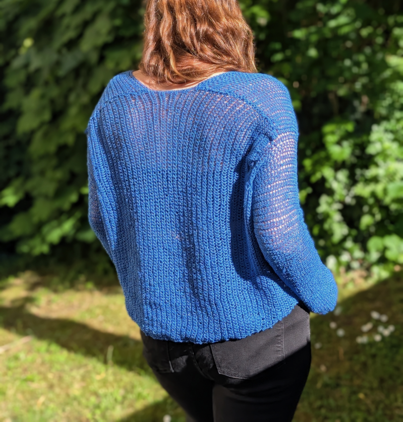 Dann werden auch mit festem Maschen die Ärmel gehäkelt und fertig ist der leichte Sommerpulli.