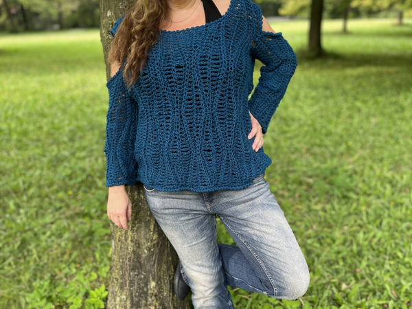Der Pullover mit seinen modernen Arm-Cut-Outs ist perfekt für die Übergangszeit im Frühling oder Herbst. Das Muster ist luftig und die Wolle leicht und doch wärmend.