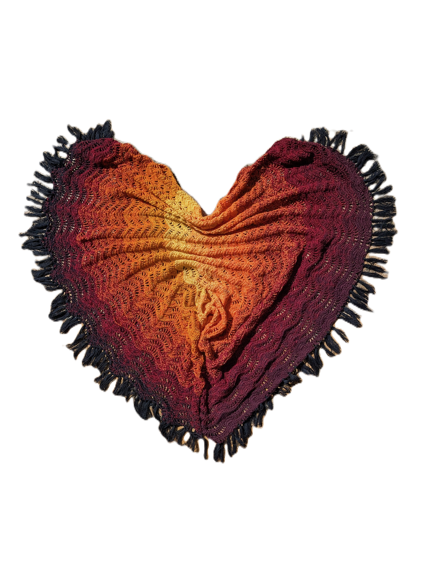 Add a touch of warmth and elegance to your look with this beautiful shawl. The scarf impresses with a fascinating color gradient from deep burgundy red to bright orange to sunny yellow, which is reminiscent of a breathtaking sunset.